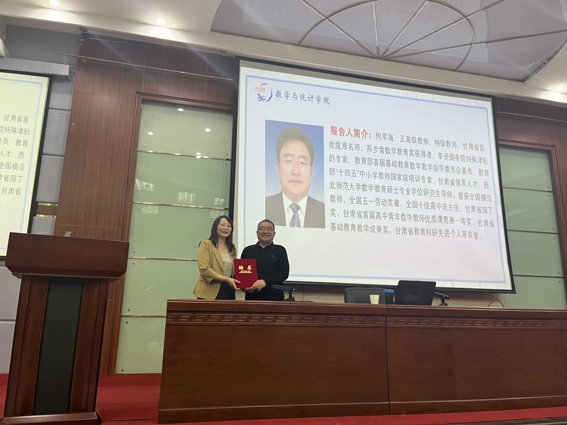 报告会前数学与统计学院学院郭育红经理为何军海老师颁发了基础教育一线教师聘书。